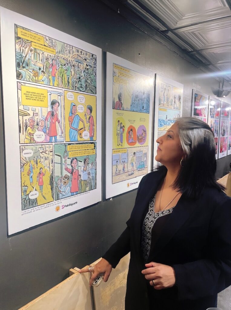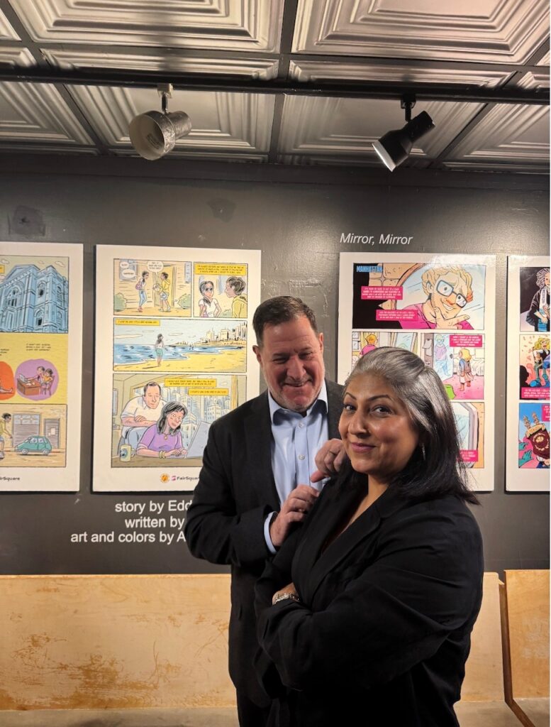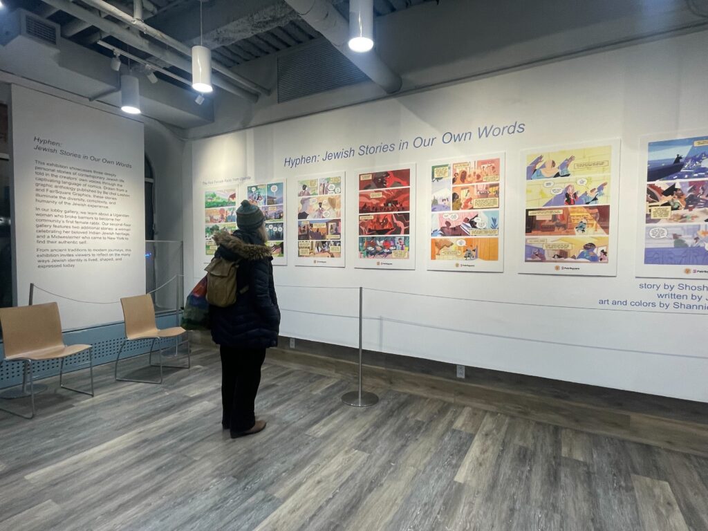 The Gallery space at the 14th Street Y on Manhattan’s Upper East Side lines its walls with three stories from Hyphen: Jewish Stories in Our Own Words, the graphic novel anthology with comics of Jews from uniquely diverse backgrounds. The gallery’s lobby level introduces visitors to the story of Rabbi Shoshana Nambi, a Ugandan woman who broke barriers to become her community’s first female rabbi. Upstairs, the gallery highlights the story of Dubbs Weinblatt, a Midwesterner who came to New York to find their authentic self. In “Mumbai-New York-via TLV” viewers enjoy Eddna Samuel’s celebration of her Indian Jewish heritage and the journey of making home wherever you are.